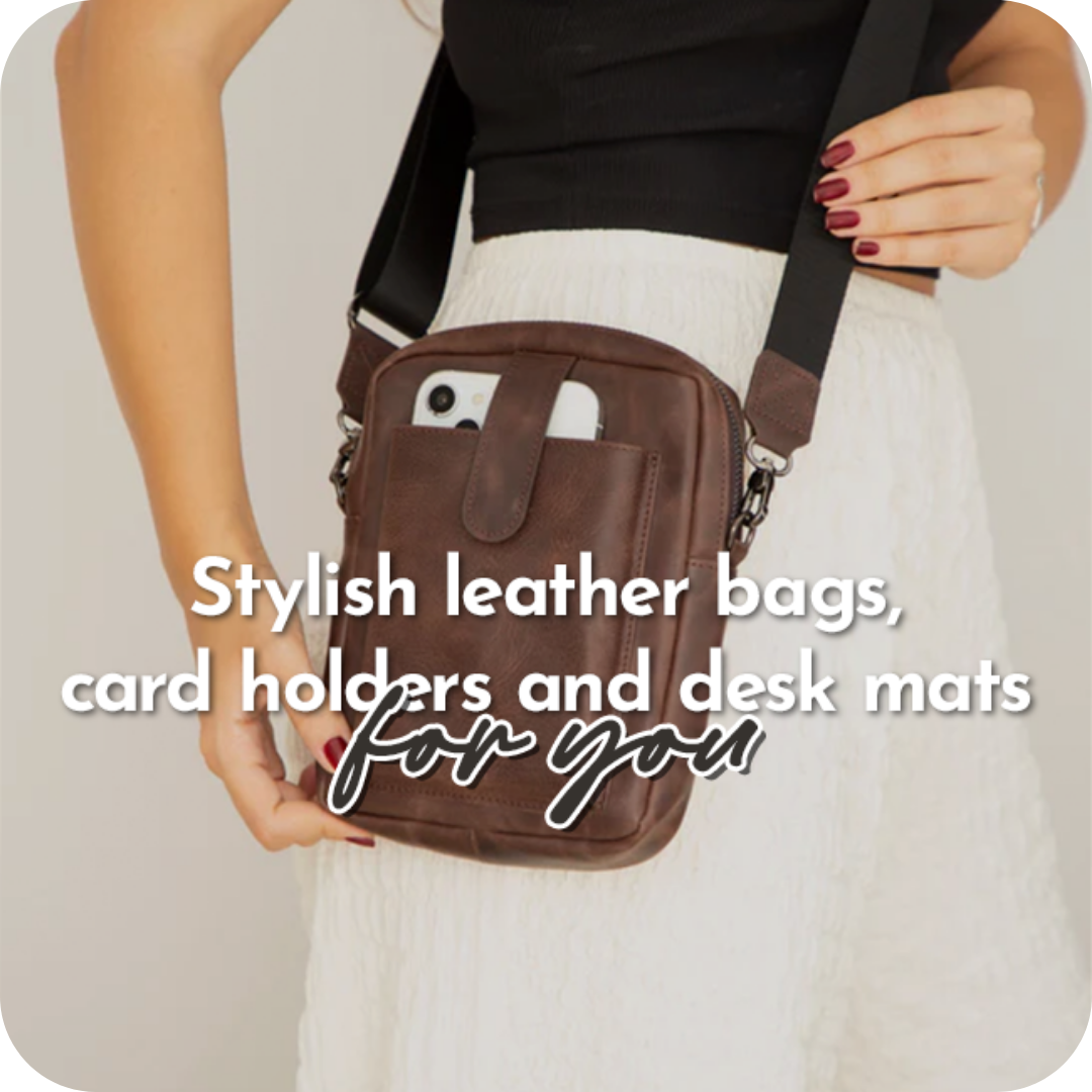 Explore stylish leather bags, card holders and desk mats designed to bring elegance to your everyday.
